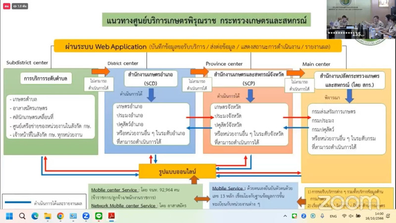 วันจันทร์ที่ 16 ตุลาคม 2566 เวลา 13.30 น. นายกรกฎ ชยุตรารัตน์ สหกรณ์จังหวัดชัยนาท เข้าร่วมประชุมชี้แจงแนวทางการดำเนินงานศูนย์บริการเกษตรพิรุณราช ของกระทรวงเกษตรและสหกรณ์ การดำเนินการจัดทำศูนย์บริการเกษตรพิรุณราช กระทรวงเกษตรและสหกรณ์ เพื่อเป็นศูนย์บริการเกษตรกร (Service Mind for Farmer Smile Center) ผ่านระบบแอปพลิเคชั่น โดยมีวัตถุประสงค์ เพื่อให้เกษตรกร และประชาชนทั่วไปสามารถขอรับบริการต่าง ๆ รวมทั้งข้อมูลด้านเกษตร ตลอดจนรับเรื่องร้องเรียน และปัญหาด้านการเกษตร ผ่านระบบแอปพลิเคชั่น เพื่ออำนวยความสะดวกและให้เกิดความรวดยิ่งขึ้น ผ่านการสื่อสารผ่านระบบออนไลน์ ระบบ Zoom meeting โดยมีนายธิติ โลหะปิยะพรรณ ผู้ช่วยปลัดกระทรวงเกษตรและสหกรณ์ เป็นประธานการประชุมฯ ดังกล่าว ในการนี้ หัวหน้าส่วนราชการสังกัดกระทรวงเกษตรและสหกรณ์ในจังหวัดชัยนาท เช้าร่วมรับฟังการประชุมฯ ครั้งนี้