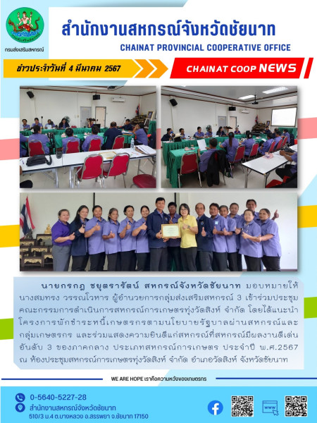 นางสมทรง วรรณโวหาร ผู้อำนวยการกลุ่มส่งเสริมสหกรณ์ 3 เข้าร่วมประชุมคณะกรรมการดำเนินการสหกรณ์การเกษตรทุ่งวัดสิงห์ จำกัด โดยได้แนะนำโครงการพักชำระหนี้เกษตรกรตามนโยบายรัฐบาลผ่านสหกรณ์และกลุ่มเกษตรกร และร่วมแสดงความยินดีแก่สหกรณ์ที่สหกรณ์มีผลงานดีเด่น อันดับ 3 ของภาคกลาง ประเภทสหกรณ์การเกษตร ประจำปี พ.ศ.2567 ณ ห้องประชุมสหกรณ์การเกษตรทุ่งวัดสิงห์ จำกัด อำเภอวัดสิงห์ จังหวัดชัยนาท