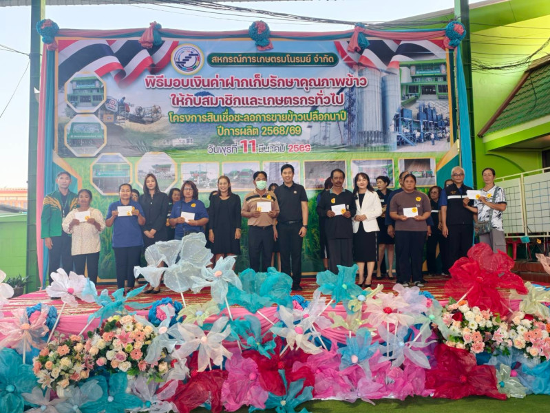 วันพุธที่ 11 มีนาคม 2569 นางสาววรรณพร บัณฑิตภูวนนท์ สหกรณ์จังหวัดชัยนาทร่วมมอบเงินค่าฝากเก็บและรักษาคุณภาพข้าวเปลือกให้กับสมาชิกสหกรณ์และเกษตรกรทั่วไป ภายใต้ “โครงการสินเชื่อชะลอการขายข้าวเปลือกนาปี ปีการผลิต 2568/69” ณ สหกรณ์การเกษตรมโนรมย์ จำกัด อำเภอมโนรมย์ จังหวัดชัยนาท โดยมีผู้อำนวยการสำนักงานธนาคารเพื่อการเกษตรและสหกรณ์การเกษตรจังหวัดชัยนาท ผู้อำนวยการศูนย์ถ่ายทอดเทคโนโลยีการสหกรณ์ที่ 13 จังหวัดชัยนาท และผู้แทนสหกรณ์การเกษตรในจังหวัดชัยนาท เข้าร่วมพิธี