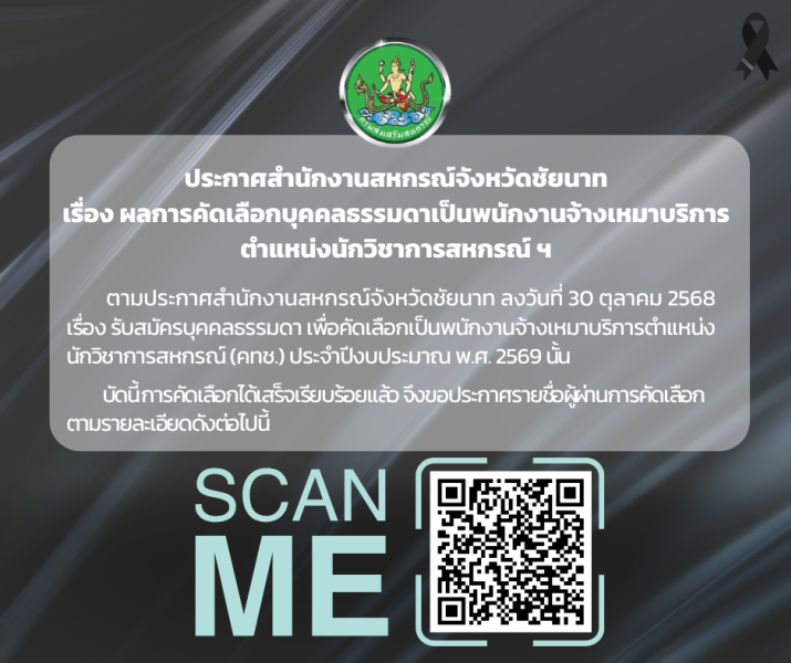 ประกาศสำนักงานสหกรณ์จังหวัดชัยนาท เรื่อง ผลการคัดเลือกบุคคลธรรมดาเป็นพนักงานจ้างเหมาบริการตำแหน่งนักวิชาการสหกรณ์ (คทช.)